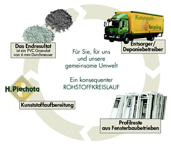 Der Marktanteil von Kunststofffenstern ist heute größer denn je zuvor. Doch bei der Entsorgung ergeben sich häufig Schwierigkeiten und es herrscht allgemeine Ratlosigkeit. Anstatt teure Wertstoffe einfach auf einer Deponie zu entsorgen, führen wir diese einem umweltverträglichen Kreislauf zu. Jeder kann seine Kunststoff-Altfenster bei uns sorgenfrei abgeben. Wir kümmern uns um das Sortieren der einzelnen Bestandteile und deren Weiterverarbeitung. Regionale Recycling-Fachbetriebe sind hier unsere Partner.